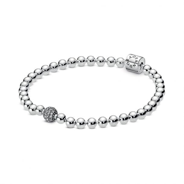 اگر به دنبال دستبندی گویدار با درخشندگی و ظرافت منحصر به فرد هستید،دستبند گوی و نگیندار گیره استوانهای پاندورا بهترین گزینه برای شماست.این طرح با الهام از پیرسینگها و استایلهای پانک طراحی شده،در عین حال به آن براقیت و ظرافت خاصی نیز افزوده شدهاست.این دستبند گویدار نقرهای، دارای گیرهی استوانهای است که روی آن لوگوی پاندورا حکاکی شده است. در طول این دستبند گوی بزرگتری در مرکز زنجیر با نگینهای شفاف زیرکُنیا تزیین شدهاست و میدرخشد.شما میتوانید این دستبند را به تنهایی یا همراه با دستبندهای دیگر پاندورا در دست داشته باشید.