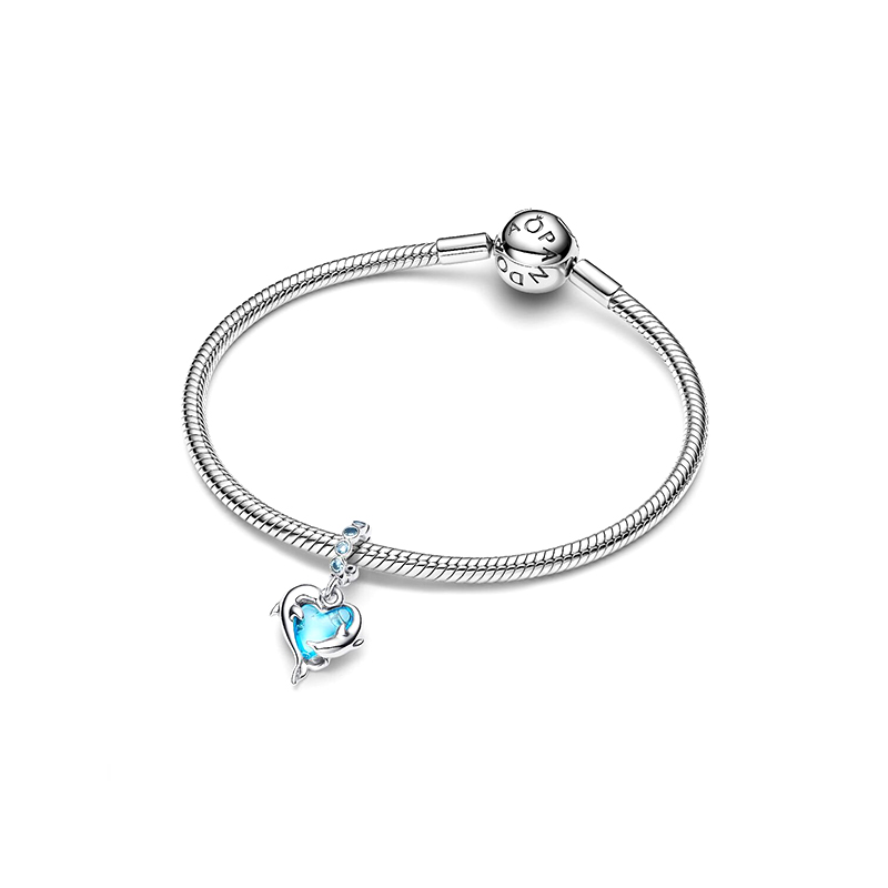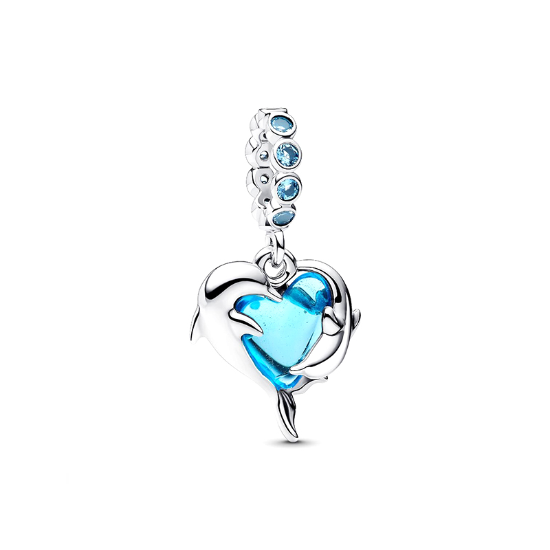 با این آویز دلفریب، به دنیای نگهبانان بازیگوش دریا شیرجه بزن؛ جایی که دو دلفین در اطراف یک قلب زیبا از کریستال مورانو به رقص درآمدهاند.
