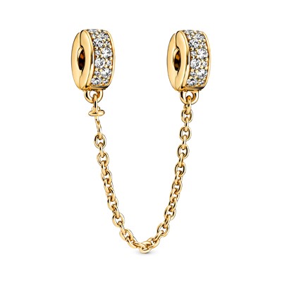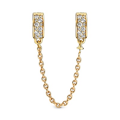 چارمهایتان را با زنجیر ایمنی طلایی و نگیندار پاندورا ایمن و شیک نگهدارید.این زنجیر ایمنی به صورت دستی با روکش طلای ۱۴ عیار ساخته شدهاست.دو طرف قزن دستبند شما گیرههایی قرار دارند که با نگینهای زیرکُنیا بیرنگ تزیین شدهاند.رنگ طلایی و درخشندگی این زنجیر جذابیت استایل شما را افزایش خواهد داد.