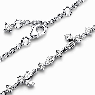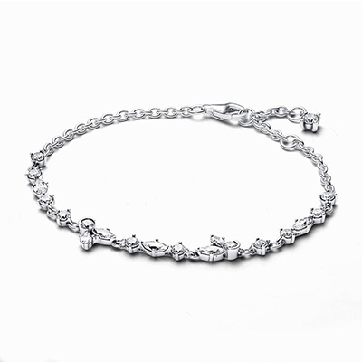 با این دستبند درخشان زیبایی طبیعت را به جواهرات خود بیاورید. این دستبند زنجیری را با گوشواره های میخی گل خوشهای پاندورا ست کرده و استایلی با ظرافت بسازید. این دستبند نقره ای با نگین های درخشان و شفافی با الهام از شکل گلبرگ و برگ های طبیعی تزیین و درخشنده شده است. این دستبند را به استایل روزمره خود اضافه کرده و درخششی منحصر به فرد داشته باشید.