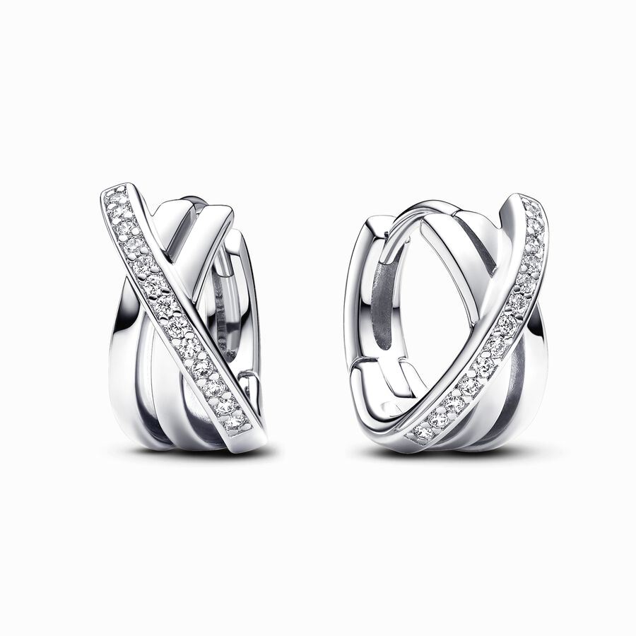 ظرافتی مدرن به استایل خود بیاورید. این گوشواره های حلقه ای که به شکل خطوطی در هم آمیخته و متقاطع طراحی شده اند با نگین های شفاف خود می درخشند. آن ها را به مجموعه گوشواره های پاندورایی خود اضافه کرده و استایل خاص خود را با آن ها بسازید.