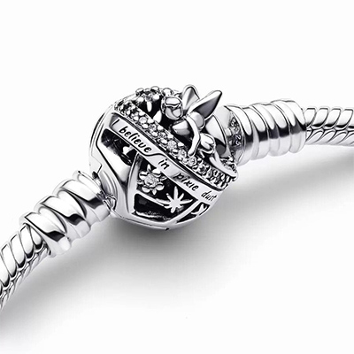 خاطرات خود را همراه با تینکربل روی این دستبند نقره ای با طرح محبوب زنجیر ماری پاندورا چیده و به استایلتان جادو اضافه کنید. روی گیره این دستبند دقایق جادویی پیام "من به گرد پیکسی باور دارم" (I believe in pixie dust) حکاکی شده است. تمامی چارم های دیزنی خود را روی این دستبند داشته و داستان جادویی خود را همه جا با خود همراه داشته باشید.