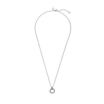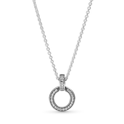 با گردنبند آویز دار دو دایرهی ادغام شده پاندورا ظاهر خود را بیان کنید.این گردنبند نقرهای که از دو دایرهی ترکیب شده با یکدیگر ساختهشده است دارای تزیینی از نگینهای زیرکُنیا شفاف است در نزدیکی گیره گردنبند دیسک کوچک دایرهای لوگوی پاندورا را نشان میدهد و شما میتوانید اندازه این گردنبند را تنظیم کنید.