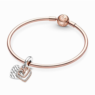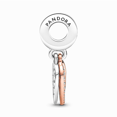 عشق خود را با چارم آویز دو بخشی قلبهای در هم تنیده پاندورا نشان دهید! این چارم شامل یک قلب با روکش رز گلد ۱۴ عیار با نگینهای دست ساز درخشنده در کنار دیسک قلبی از جنس نقره است که پیام "تو را بی شرط دوست دارم" (I Love You Unconditionally) روی آن حکاکی شدهاست.این چارم هدیهای عالی برای کسی است که همیشه جایگاه ویژهای در قلبتان دارد.