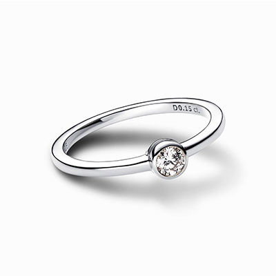 این حلقه زیبا از جنس نقره بوده و دارای الماسی ساخته شده در آزمایشگاه با قیراط 0.15 است. این حلقه ساده بهترین گزینه برای ساخت ظاهری مدرن است. شما می توانید این طرح را با الماس های دیگر پاندورا ست کرده و بیشتر از همیشه بدرخشید.
