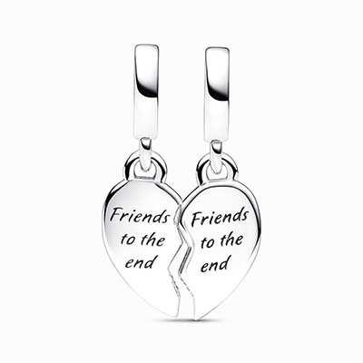 بهترین چارم برای شما و دوستان شما در روزهای سخت. پیام"دوست تا آخر" روی هر دو بخش این چارم آویز و نقره ای حکاکی شده است.اطراف این دو بخش از یک قلب شکسته با نگین های شفاف تزیین شده است. این چارم را با دوست صمیمی خود ست کرده و در کنار هم یک قلب کامل داشته باشید.