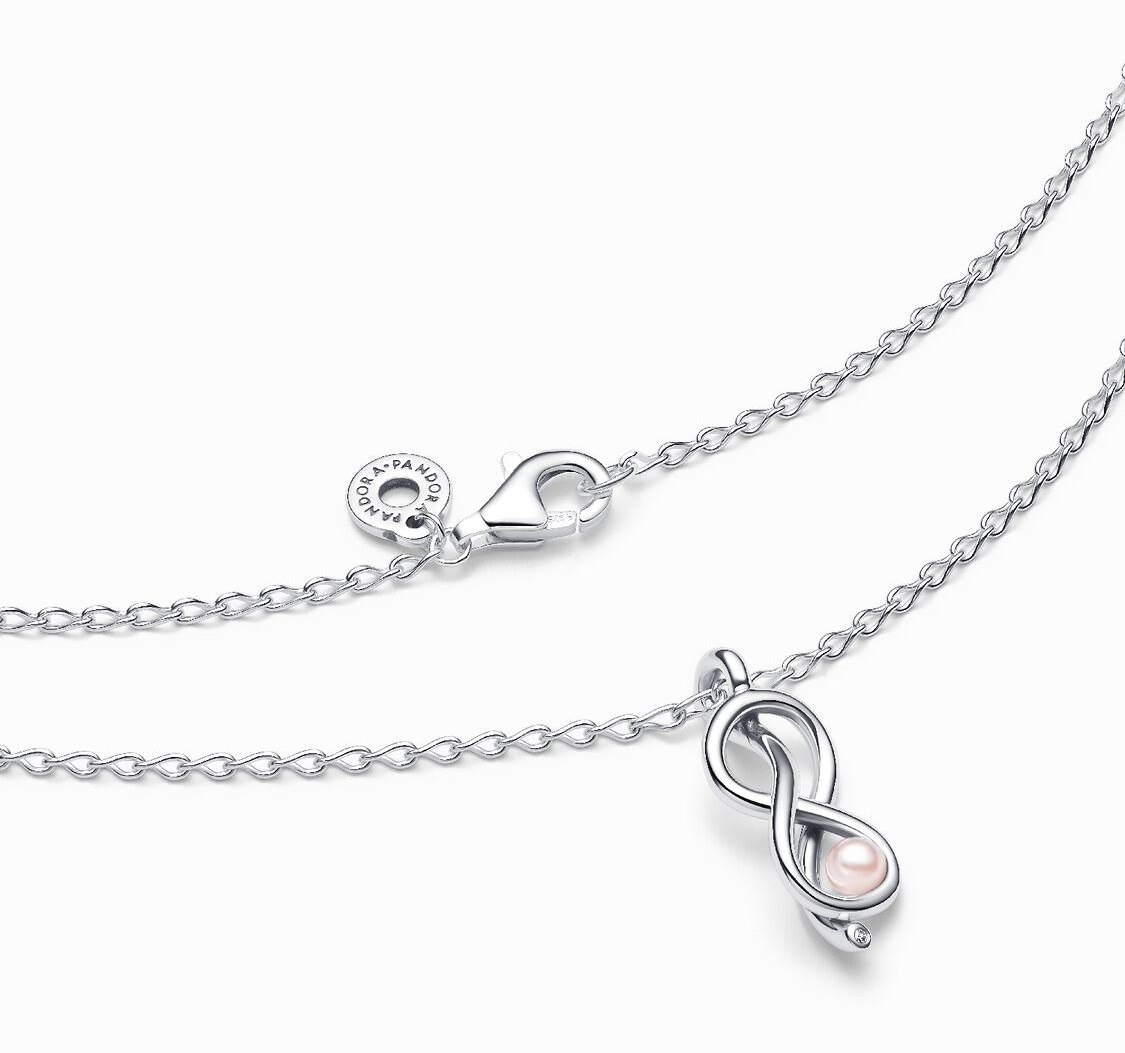 این گردنبند یک مروارید صورتی مصنوعی درخشان دارد که در درون گره بینهایت جا گرفته است که نماد عشق جاودانه بوده و قابل تنظیم برای تناسبی بینقص است.