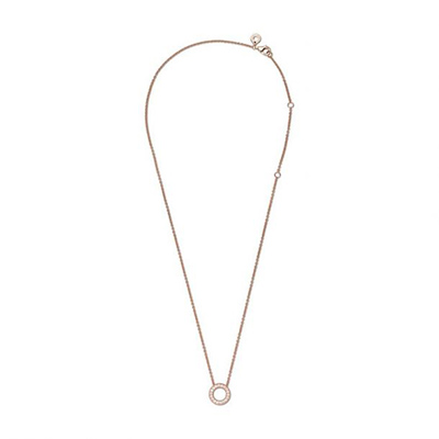 استایلی ظریف و زیبا با گردنبند نگیندار دایره رزگلد پاندورا داشته باشید.این گردنبند که به صورت دستی ساخته میشود دارای روکش رزگلد ۱۴ عیار بوده و شمایل یک دایره تو خالی را دارد که طرفی از آن با نگینهای زیرکُنیا شفاف تزیین شده و در طرف دیگر آن لوگوی پاندورا حکاکی شده است.شما میتوانید اندازه زنجیر را تنظیم کنید. این گردنبند مناسبترین گزینه برای هر موقعیتی است چه برای استفاده روزانه و چه برای مراسمی خاص.