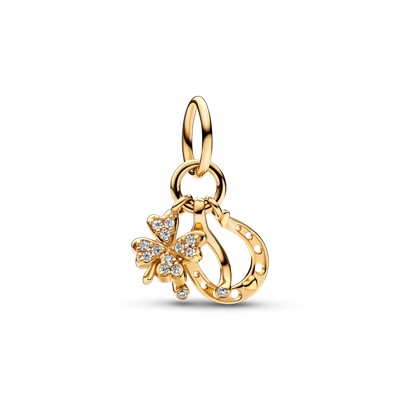 تمام نمادهای خوش شانسی را به رنگ طلای 14 عیار با این چارم آویز سه بخشی به استایلتان اضافه کنید.چارم آویز شبدر چهار برگ،جناغ و نعل اسب خوششانسی طلایی پاندورا دارای نگین های درخشان و شفاف زیرکنیا بر روی استخوان جناغی آرزوها، شبدر چهاربرگ و روی نعل اسب است. با این قطعه خاص از پاندورا برای عزیزانتان آرزوی عشق، موفقیت و محافظت کنید.