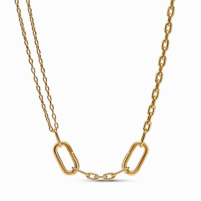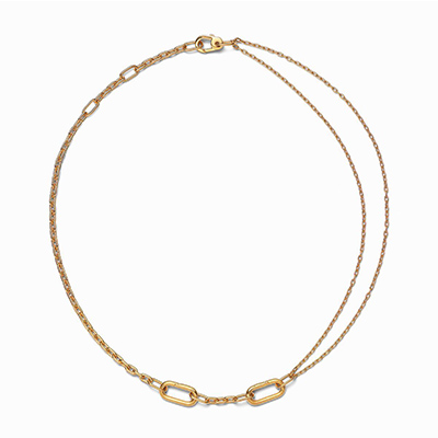 این گردنبند با دو زنجیر باریک و دو اتصال دهنده قابل باز شدن به شما امکان می دهد استایل خاص خود را طراحی کنید.نیمی از گردنبند به یک زنجیره دوتایی متصل می شود و یک لبه جداگانه به زنجیر اضافه می کند.میتوانید طول اصلی را نگه دارید، زنجیره پیوند خود را طولانیتر کنید یا آن را به چوکر تبدیل کنید، همه اینها با افزودن و برداشتن پیوندهای این گردنبند ممکن است. با آویزهای مورد علاقه خود می توانید این گردنبند ام-ای را تزیین کنید.