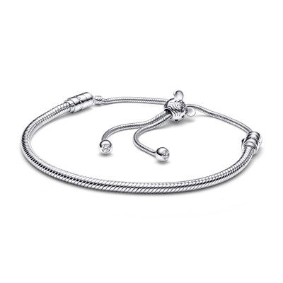 با دستبند کشویی میکی موس و پارک دیزنی پاندورا خاطرات با ارزش خود در پارک های دیزنی را گرامی بدارید. این دستبند نقره ای دارای گیره ای کشویی و لغزنده است که با حرکت آن می توانید اندازه ی دستبند را دور مچ دست خود تنظیم کنید. این گیره که داخل آن سیلیکونی می باشد به شکل سر شخصیت محبوب دیزنی یعنی میکی موس طراحی و ساخته شده است. به این دستبند چارم های مورد علاقه دیزنی خود را اضافه کرده و استایلی جادویی بسازید.