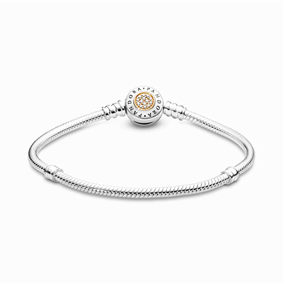 هر کلکسیون چارمی نیازمند دستبندی زیباست تا بهتر خودنمایی کند.دستبند دقایق کلاسیک پاندورا اکنون به شکلی دیگر درآمده است تا استایل شما را درخشانتر از قبل کند.این دستبند دقایق نقرهای و زیبا، دارای گیرهای دو رنگ است.مرکز این گیره دارای روکش طلا ۱۴ عیار بوده و با نگینهای شفاف زیرکُنیا تزیین شده است.چارمهای خود را روی این دستبند لاکچری مستقر کرده و بدرخشید یا آن را به عزیزانتان هدیه دهید تا آنها کلکسیون چارمهای خود را به نمایش بگذارند.