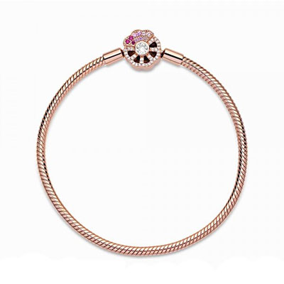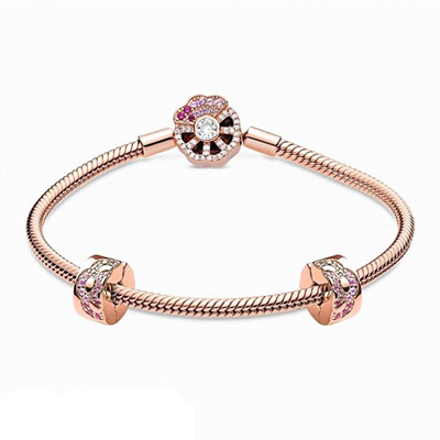 این دستبند درخشان را به استایل خود اضافه کرده و زیباتر از همیشه بدرخشید. گیره این دستبند با روکش رزگلد 14 عیار به صورت دستی به شکل بادبزنی سنتی طراحی و با نگین های شفاف و صورتی درخشان شده است. آن را به تنهایی در دست داشته یا با چارم های مورد علاقه خود تزیین کرده و استایلی خاص بسازید.
