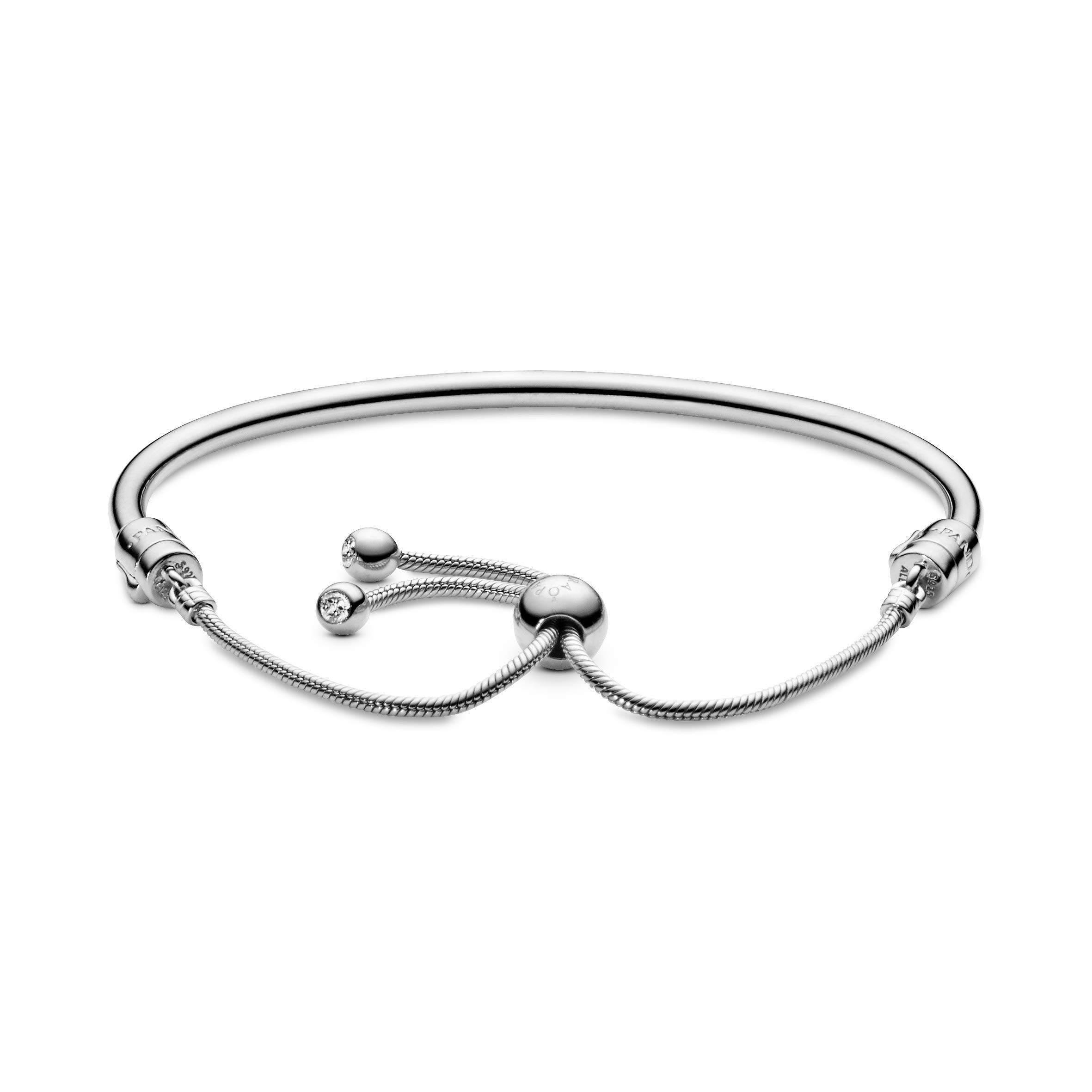 ترکیبی فوقالعاده از دستبندهای کشویی نرم و دستبندهای النگویی پاندورا.با حرکت دادن گیرهی کشویی اندازهی این دستبند دو بخشی را برای مچ دستتان تنظیم کنید.در انتهای هر بخش نگینهای شفاف زیرکُنیایی میدرخشند و به زیبایی این دستبند شیک میافزایند.این دستبند را به تنهایی در دست داشته یا آن را با دستبندهای پاندورایی دیگر ست کرده و استایل خاص خود را بسازید.