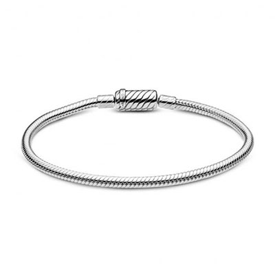 با این طرح جدید از دستبندهای دقایق مجموعه خود را ارتقا دهید. این دستبند با زنجیر ماری محبوب پاندورا به صورت دستی طراحی و ساخته شده است.برای باز کردن دستبند و رها شدن نوک مغناطیسی، کافی است میله بلند شده با آرم پاندورا در بالای گیره را عقب بکشید. همان گیره را به عقب بکشید و نوک مغناطیسی را جایگزین کنید تا بسته شود. این دستبند را با 15 تا 20 چارم تزیین کرده و استایل شخصی خود را بسازید.