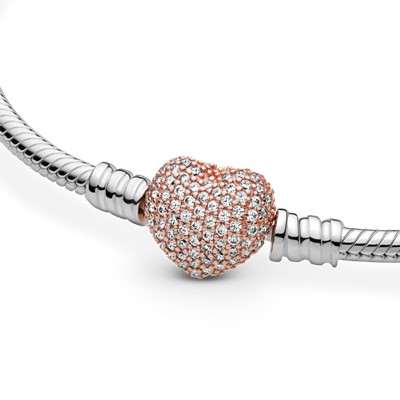 به استایل خود و چارمهای عزیزتان درخشش و رمنس اضافه کنید.این دستبند زیبای نقرهای،زنجیری با طرح محبوب ماری پاندورا داشته و با گیرهای که روکش رز گلد ۱۴ عیار دارد و قلبی شکل و چرخان است،طراحی شدهاست. طرفی از این گیره با نگینهای درخشان تزیین شده و در طرف دیگر آن لوگوی پاندورا حکاکی شدهاست.شما به سادگی با چرخاندن گیره میتوانید دو استایل متفاوت ایجاد کنید.این دستبند دقایق را به تنهایی، یا با چارمهای مورد علاقه خود در دست داشته و بدرخشید.