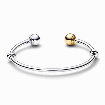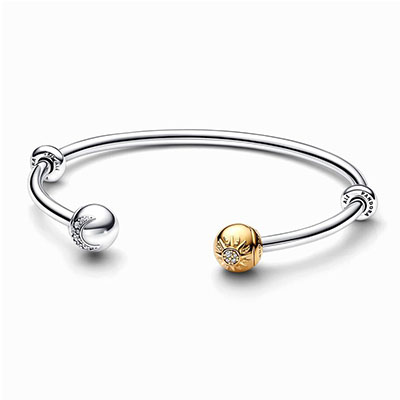 زیبایی آسمانی درون خود را به استایلتان بیاورید! این دستبند دو رنگ با الهام از زیبایی های پر رمز و راز آسمان بالای سرمان طراحی و ساخته شده است. این دستبند نیمه باز تزیین شده با نگین های شفاف بوده و دارای طرح خورشید درخشان و ماهی هلالی است. این دستبند را به جواهرات با طرح مشابه پاندورایی خود اضافه کرده و استایل آسمانی خود را کامل کنید.
