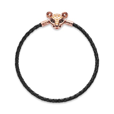 این دستبند چرمی و زیبا تا ۹ چارم مورد علاقه شما را میتواند روی خود داشته باشد.این چارم بافت دارای گیرهای به شکل یک پلنگ وحشی با روکش رزگلد ۱۴ عیار بوده و خالهای او با نگینهای درخشان زرد به نمایش گذاشته شدهاند.جزییات دیگر چهرهی پلنگ شما مانند چشمها، با لعاب مشکی به صورت دستی لعابکاری شده است.این دستبند را به یاد یک ماده شیر یا یک پلنگ زیبا به تنهایی در دست داشته یا با دستبندهای مشابه ست کرده و استایل خاص خود را بسازید.