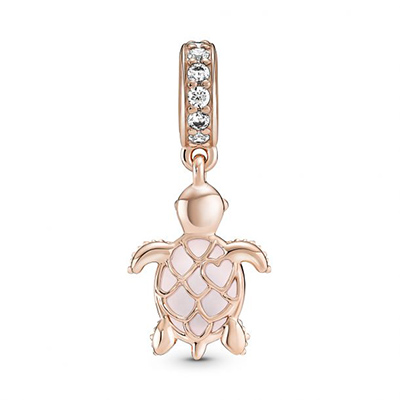 چارم آویز معروف لاکپشت دریایی پاندورا دیگر تنها نیست و این دوست لاک صورتی را به همراه دارد! این چارم آویز دارای روکش رزگلد ۱۴ عیار است و لاک لاکپشت کوچک شما از جنس کریستال مورانو صورتی طراحی شدهاست تا نور را به شکل خاصی منعکس کند.گیرهی این چارم زیبا با نگینهای زیرکُنیا برای درخشش بیشتر تزیین شده است.شما اکنون میتوانید به کلکسیون چارمهای دریایی خود لاکپشتهای زیبای بیشتری اضافه کنید!