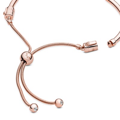 ترکیبی فوقالعاده از دستبندهای کشویی نرم و دستبندهای النگویی پاندورا.با حرکت دادن گیرهی کشویی اندازهی این دستبند دو بخشی را برای مچ دستتان تنظیم کنید.در انتهای هر بخش نگینهای شفاف زیرکُنیایی میدرخشند و به زیبایی این دستبند شیک میافزایند.این دستبند را به تنهایی در دست داشته یا آن را با دستبندهای پاندورایی دیگر ست کرده و استایل خاص خود را بسازید.
