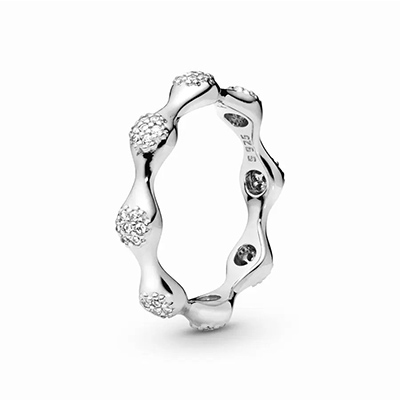 این حلقه برداشتی مدرن از طرح های مشابه پاندوراست.این حلقه نقره ای دارای برآمدگی هایی است که با نگین های شفاف و درخشان تزیین شده اند. این طرح مدرن را به استایل منحصر به فرد خود اضافه کرده و بیشتر از قبل بدرخشید.