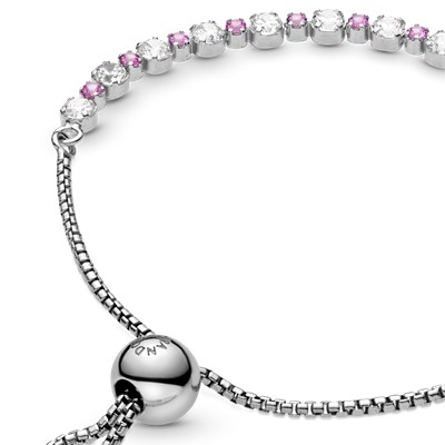 با دستبند کشویی نگین صورتی و شفاف پاندورا، نت صورتی جدیدی به ظاهر خود اضافه کنید. این دستبند تنیسی از جنس نقره بوده و با نگینهای زیرکُنیا شفاف و یاغوت مصنوعی صورتی با اندازههای متفاوت تزیین شده است.این دستبند دارای گیره کشویی قابل تنظیم است.این قطعه کلاسیک را به مجموعه دستبندهای پاندورایی خود اضافه و سالها از آن استفاده کنید.
