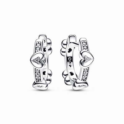درخشش استایل خود را به مرحله ای جدید ببرید! این گوشواره های حلقه ای و نقره ای با الهام از طرح قلب های درخشان پاندورا ساخته شده و با نگین های شفاف تزیین شده است. این گوشواره ها را در استایل جدید خود با طرح های مشابه ست کرده و ظاهری عاشقانه و درخشان بسازید.