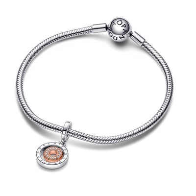 باری دیگر طرح ساده در عین حال نمادین پاندورا به صورت چارمی آویز و دو رنگ برگشته است! این چارم دارای دو دایرهی دو رنگ است، که دایرهی داخلی متحرک و دارای روکش رزگلد ۱۴ عیار بوده و با ردیفی از نگینهای شفاف زیرکُنیا تزیین شدهاست.دایرهی خارجی دایرهای نقرهای و صیقلی است که آن را به گزینهای پویا و شیک برای استایل شما تبدیل میکند.این طرح را به چارمهای لوگودار دیگر پاندورا اضافه کرده و استایلی مدرن بسازید.