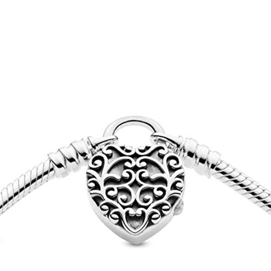 این دستبند زنجیر ماری نقرهای و گیرهی قلبی شکل آن به هر استایلی فضای مجلل میدهند.شما میتوانید این دستبند طرحدار زیبا را به تنهایی در دست داشته یا آن را بعد از شخصیسازی با چارمهای مورد علاقه خود، با دستبندهای دیگر پاندورا ست کرده و استایلی چند لایه و زیبا بسازید.