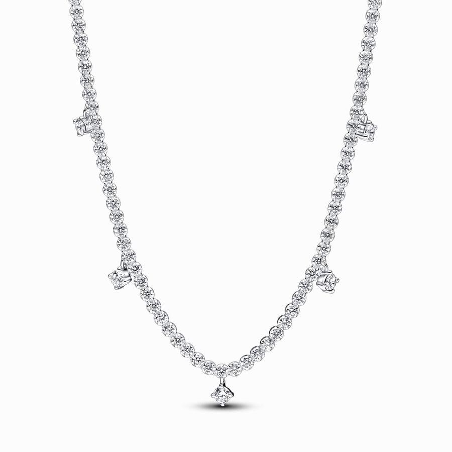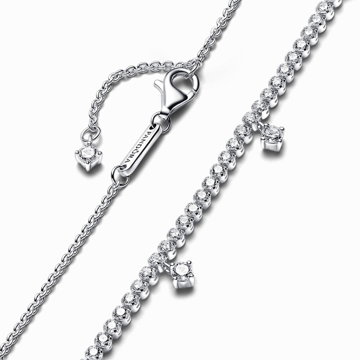 با این طرح گردنبند درخشان و زیبای پاندورا ظاهری کلاسیک برای خود بسازید. این گردنبند زیبا که با نگین های شفاف تزیین شده است را با دستبند مشابه آن ست کرده و بیشتر از همیشه بدرخشید.