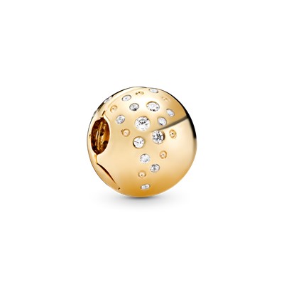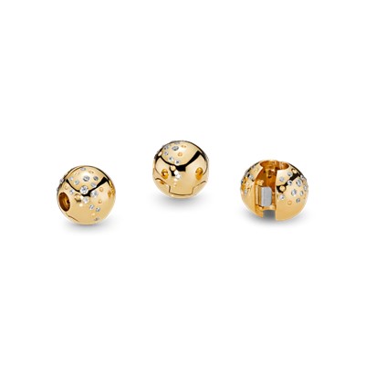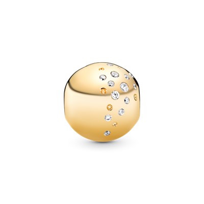 روی این چارم کلیپی و کروی درخشش پاشیده شده است! این چارم طلایی با روکش طلا 18 عیار به صورت دستی صیقلی و با نگین های شفاف به صورت پراکنده تزیین شده است. آن را برای ایجاد استایلی شیک و مدرن به دستبند دقایق خود اضافه کرده و بدرخشید.