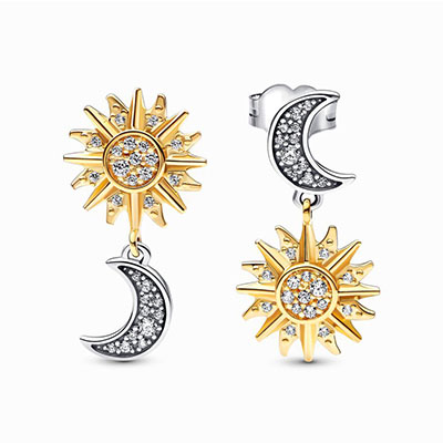 زیبایی آسمانی درون خود را با این گوشواره ها به استایلتان بیاورید! این گوشواره دو رنگ برای درخشش هرچه بیشتر با نگین های شفاف تزیین شده است. این گوشواره های درخشان دارای طرح خورشید درخشان و ماهی هلالی پاندورا هستند. این گوشواره ها را به جواهرات با طرح مشابه پاندورایی خود اضافه کرده و استایل آسمانی خود را کامل کنید.
