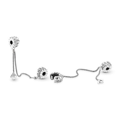 زنجیرهای ایمنی پاندورا طراحی شدهاند تا ایمنی برای چارمهای مورد علاقه شما روی دستبندتان به ارمغان بیاورند.این زنجیر ایمنی نقرهای و دستساز با الهام از نماد سعادت، پرباری و ثروت یعنی دانهی گندم طراحی شدهاست.این زنجیر ایمنی دارای گیرههایی سیلیکونی بوده و درجای خود ثابت خواهد ماند.زنجیر این کار به گونهای طراحی شدهاست که گره نخورد. قبل از اضافه کردن چارمهای خود یک گیره را به دستبند وصل کرده و سپس با بستن گیرهی دوم چارمهای خود را ایمن و ثابت روی دستبند مورد علاقهتان نگه خواهید داشت.