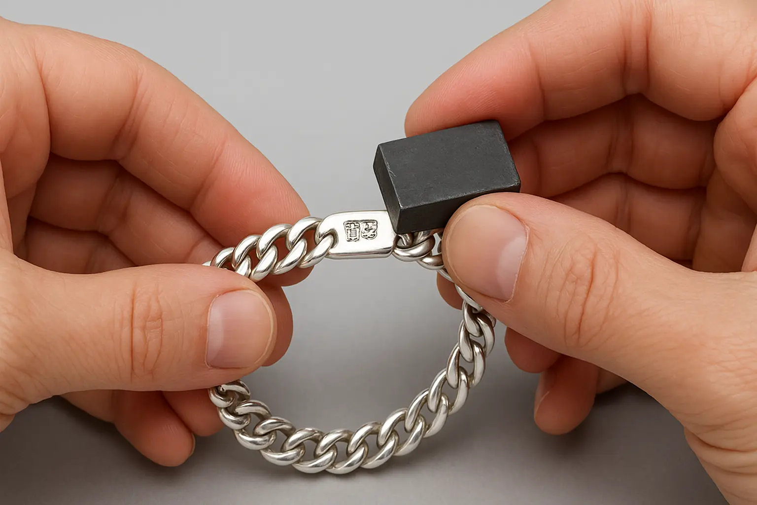 اگر آهنربا همراه شما باشد به راحتی از جذب نشدن دستبند نقره به آن متوجه اصل بودن آن شوید. چراکه وقتی ناخالصی استاندارد نباشد دستبند به آهنربا میچسبد.